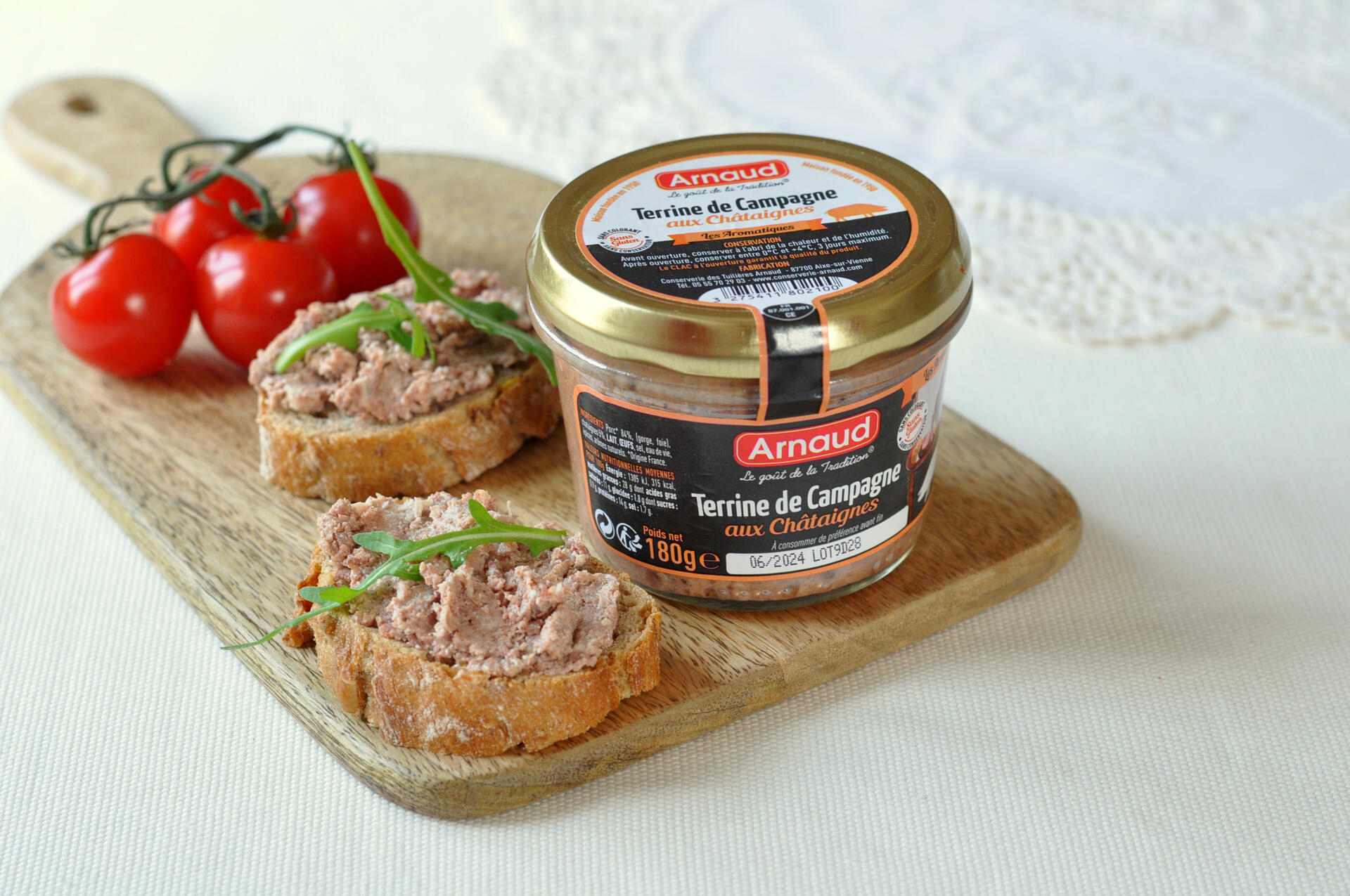 Společnost Arnaud byla založena v samém srdci Limousin (Aixe sur Vienne) v roce 1969. Tento rodinný podnik se již od počátku zabývá tradiční výrobou paštik a konzervovaného masa. Arnaud – Chuť tradice, je moderní, dynamickou společností na evropském trhu a může se pochlubit kvalitními a originálními výrobky dle tradičních receptů z vybraných surovin. Francouzská terrina je tradiční francouzská hrubozrnná paštika. Připravuje se z vepřového, telecího nebo drůbežího masa, ale také z kachních či husích jater. Obsahuje větší kousky masa, než je tomu u klasické paštiky. Terriny Arnaud se vyrábějí tradiční metodou bez přídavku barviv, konzervantů a emulgátorů. Tato terrina je vyrobena z vepřového masa a ochucena kaštany.